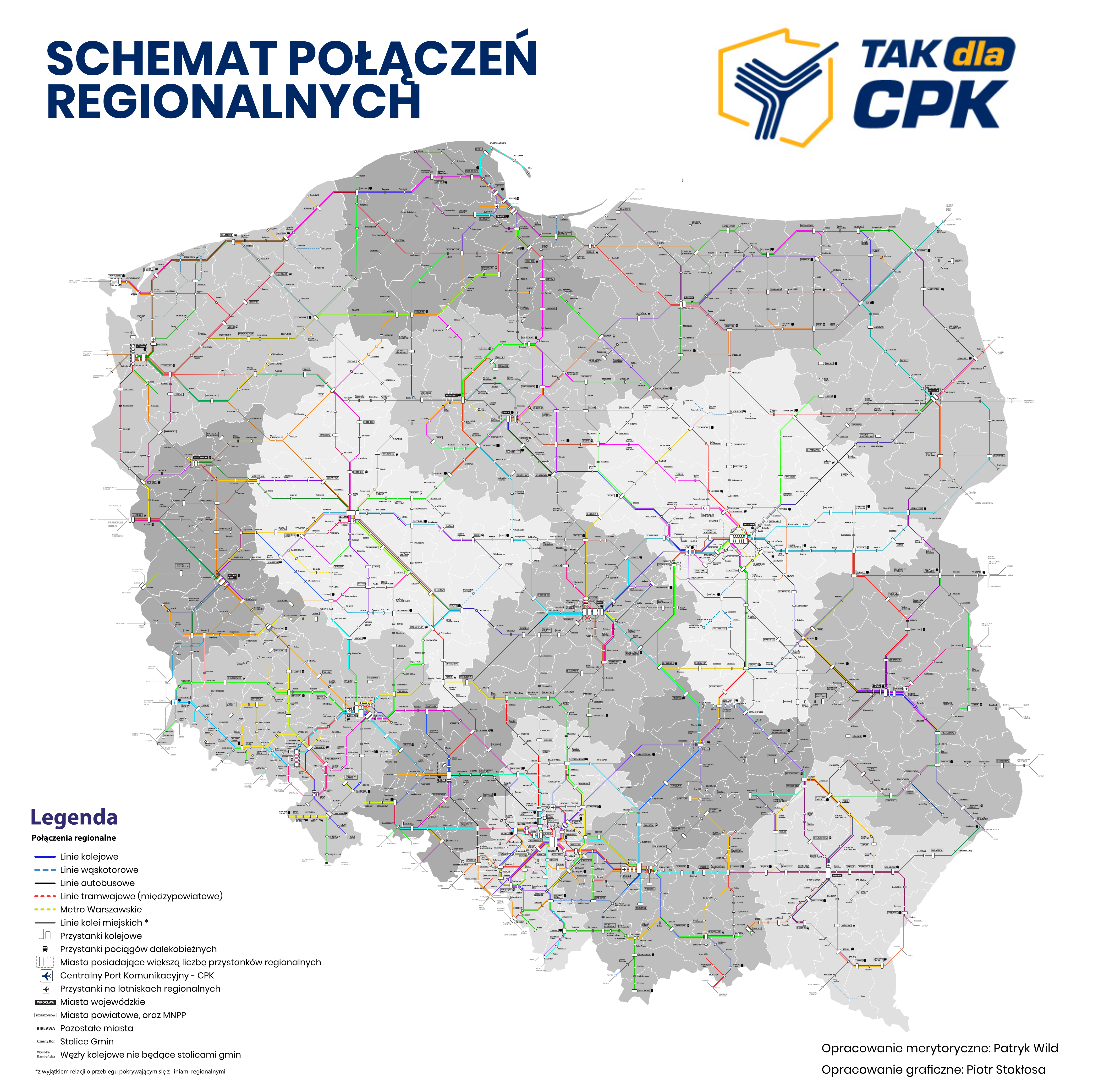 Projekt „CPK+” jest kompleksowy i zakłada, że kolej jest optymalnym środkiem transportu zarówno pomiędzy gminami i powiatami, jak i w ruchu aglomeracyjnym. Kompatybilność przewozów kolejowych – normalnotorowych i wąskotorowych, regionalnych przewozów autobusowych i miejskich systemów transportu jest kluczem do rozwoju spójnej komunikacji w całym kraju. Odpowiedzią na wyzwania jest budowa wielu linii kolejowych, nowych terminali intermodalnych i węzłów transportowych, zgodnie z projektem „CPK+”. Stowarzyszenie Tak dla CPK prezentując ten projekt zabiera głos w dyskusji zanim rząd zaprezentuje swoją wizję Zintegrowanej Sieci Kolejowej. Zakładamy przy tym, że realizacja wszystkich założeń tego projektu powinna trwać 20 lat: do 2045 roku.